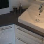Plan de toilette avec angle ouvert, béton ciré gris baho.