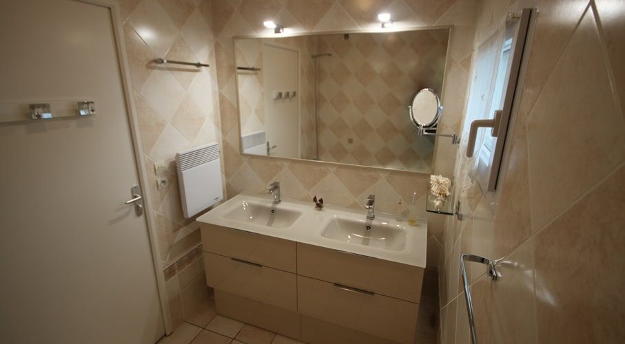Plan de toilette en verre extra clair laqué (RAL 1015) écru avec 2 vasques avec trop plein.