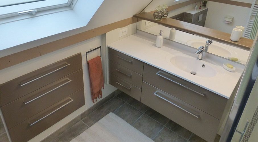 Meuble de salle de bain sous combles avec miroir découpé selon la pente.