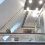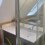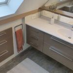 Meuble de salle de bain sous combles avec miroir découpé selon la pente.