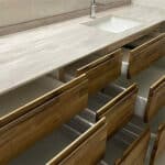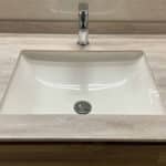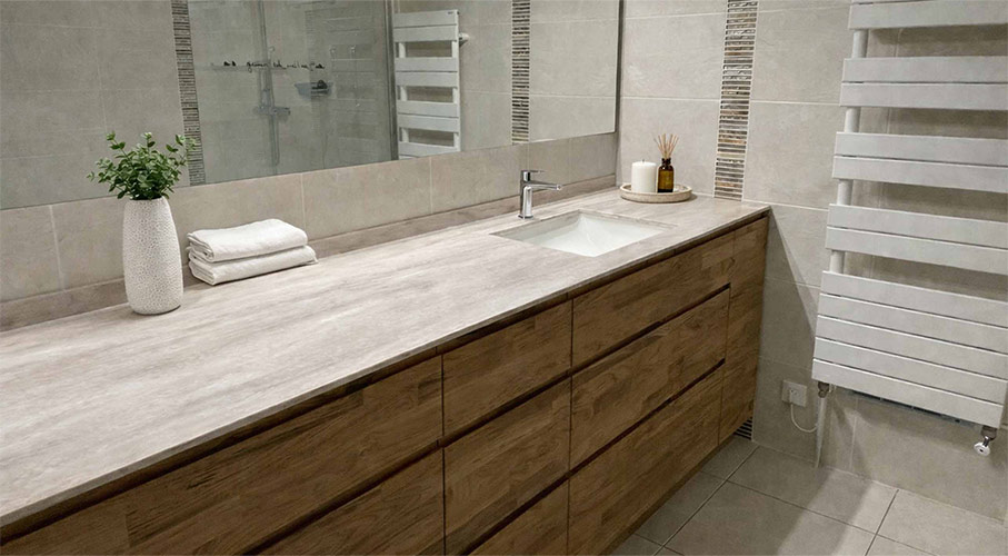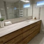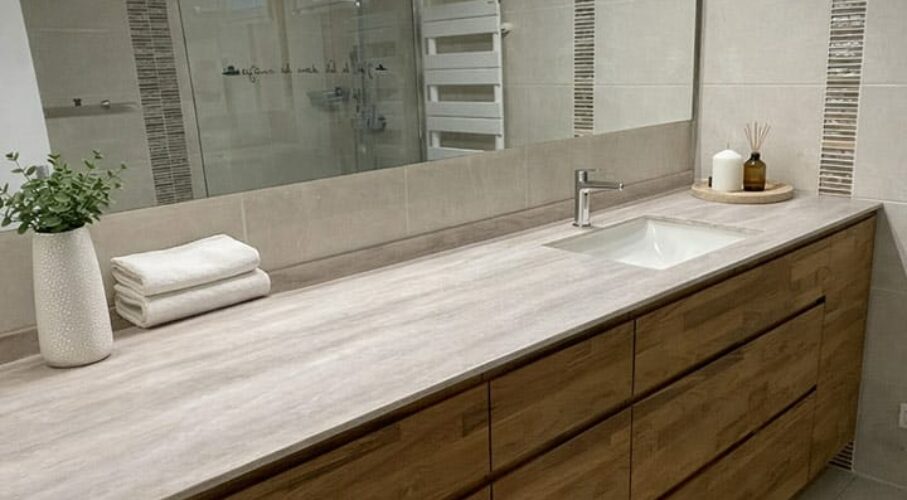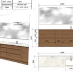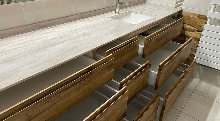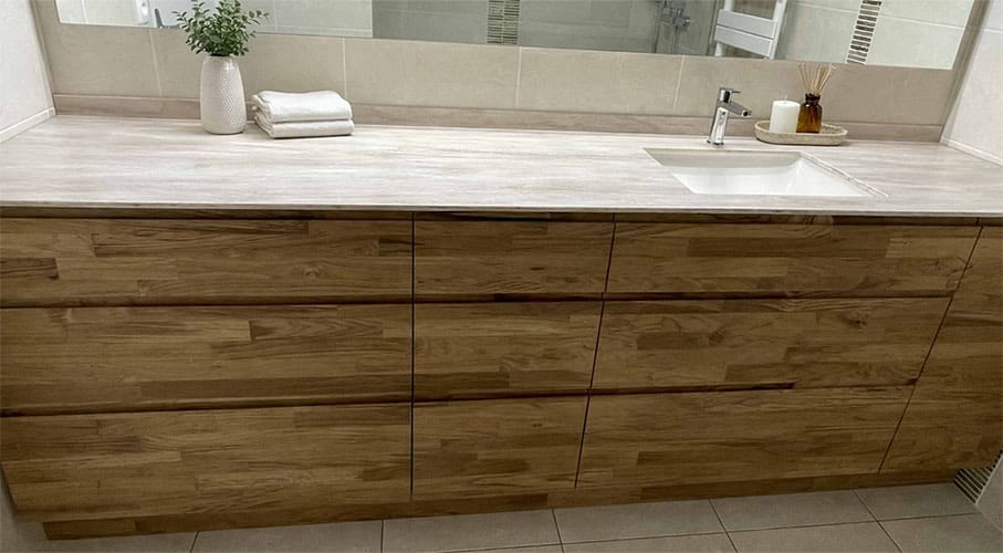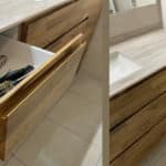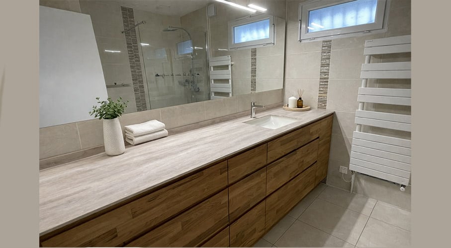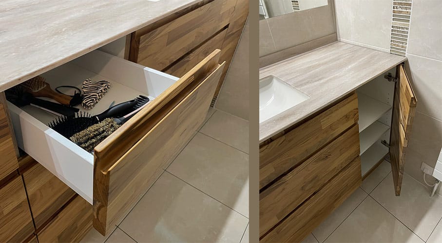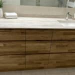 Le meuble de salle de bain Manado en teck massif sur mesure allie élégance naturelle, fonctionnalité et finitions haut de gamme. Réalisé pour un aménagement entre-murs, il s’intègre parfaitement à la pièce grâce à ses façades en teck lamellé massif et à son plan en résine imitation travertin, en harmonie avec la faïence et le carrelage existants.