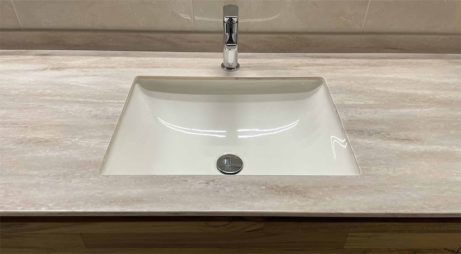 - Plan toilette Solid Surface marbré M624 Aurora Cocoa : largeur 246 cm x profondeur 56 cm x épaisseur 1,2 cm