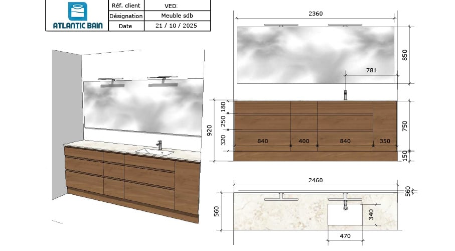- Meuble sous-vasque 3 tiroirs : largeur 84 cm x hauteur 75 cm x profondeur 54 cm, profondeur du tiroir haut 40 cm, profondeur des 2 tiroirs du bas 45 cm avec vide sanitaire de 7 cm