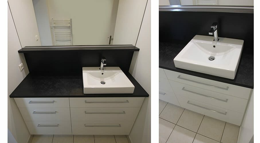 Le client souhaitait un meuble de salle de bains s'intégrant parfaitement entre murs pour utiliser tout l'espace disponible et facilité l'entretien.
