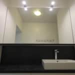 Nous avons réalisé un meuble sur mesure avec un miroir tablette. Une plinthe installée en bas de meuble permet un entretien plus simple. Des façades en mélaminées ont été préconisées pour leur bon rapport qualité / prix.