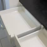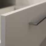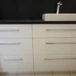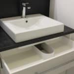 Le client souhaitait un meuble de salle de bains s'intégrant parfaitement entre murs pour utiliser tout l'espace disponible et facilité l'entretien.