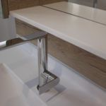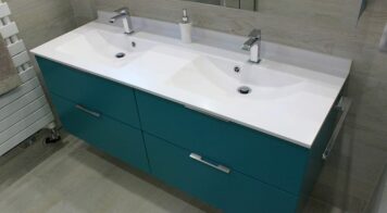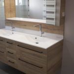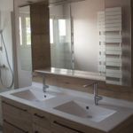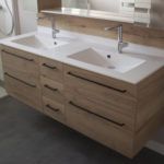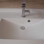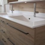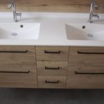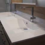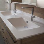 - Plan toilette Solid Surface blanc satiné – Largeur 160 x profondeur 56 x ép 1,5 cm. Dosseret hauteur 5 cm – 2 vasques moulées Madrid avec trop plein