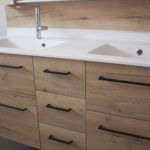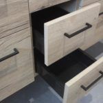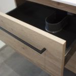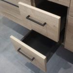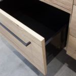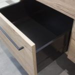 Façades et Caisson mélaminé : Chêne Halifax Naturel – Intérieur tiroirs Noirs.