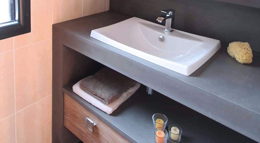 Structure en panneau de particules hydrofuge recouvert d’un enduit minéral aspect béton « Baho ».