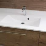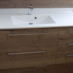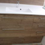 - Plan toilette Solid Surface blanc satiné – en faux équerrage. Largeur 124,5 arrière / 123,6 devant x profondeur 56 x ép 1,5 cm Dosseret hauteur 5 cm – 1 vasque Madrid avec trop plein – vasque à gauche.