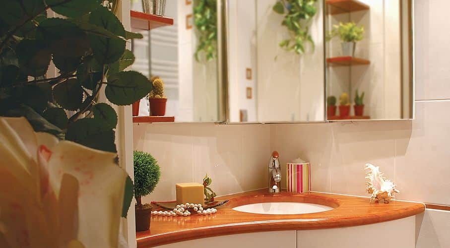 Tablette déco à gauche du miroir triptyque en hêtre teinté merisier sur un fond miroir.