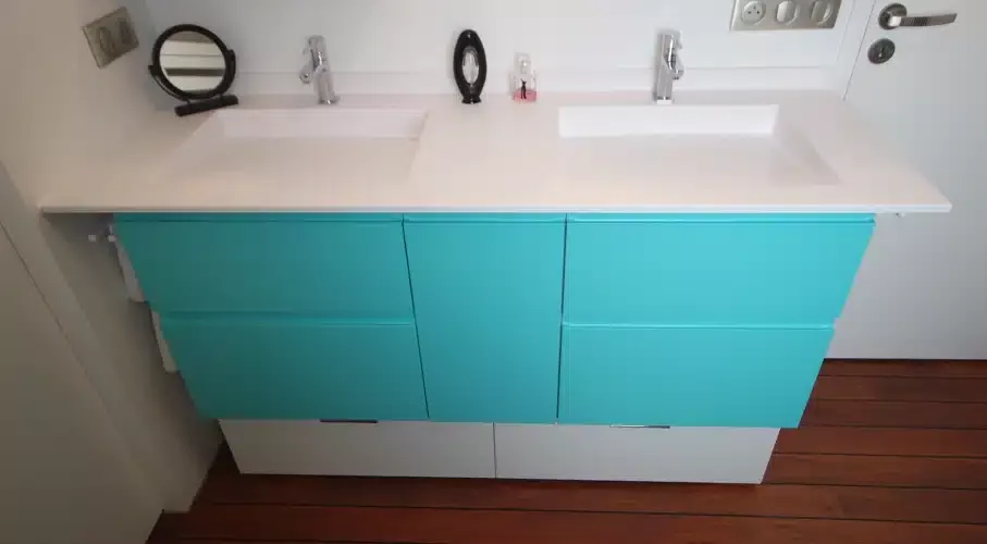 Plan en résine solid surface blanc satiné avec vasques moulée et écoulement libre.