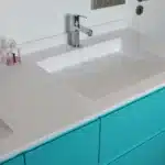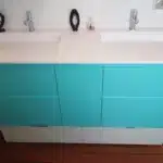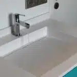 Plan en résine solid surface blanc satiné avec vasques moulée et écoulement libre.