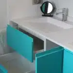 Meuble de salle de bain comprenant de nombreux rangements tiroirs et des portes serviettes télescopiques très pratiques.