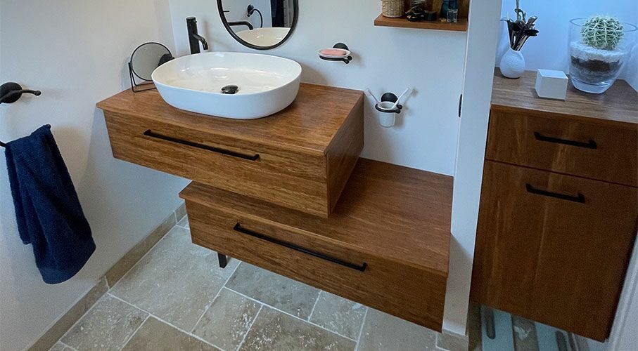 Façades, plans et côtés visibles des meubles en bambou density vernis – Tiroir et intérieur mélaminé blanc.