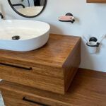 Façades, plans et côtés visibles des meubles en bambou density vernis – Tiroir et intérieur mélaminé blanc.