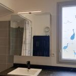 Largeur 85 x hauteur 85 x profondeur 19 cm Caisson mélaminé chêne Halifax naturel – 3 étagères Largeur de porte largeur 35 + 50 cm. Prise de mains sous la porte. Miroirs collés au dos des 2 portes. - Applique led Irène – larg 50 cm – noir mat – IP44 – 10W – 5700K – blanc froid – de Ottofond