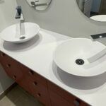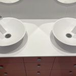Largeur 132 x profondeur 50 x ép 1,5 cm Avec perçages trous de bonde et trous de robinet - Vasques Doma minor à poser avec les bords fin – solid surface blanc satiné – Ø 38 x hauteur 9,5 cm