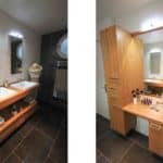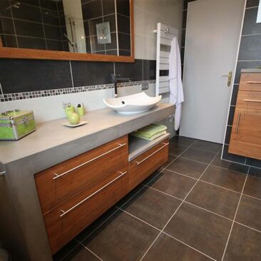 Meuble, plan de toilette et coffrage vide sanitaire en bambou caramel vernis.