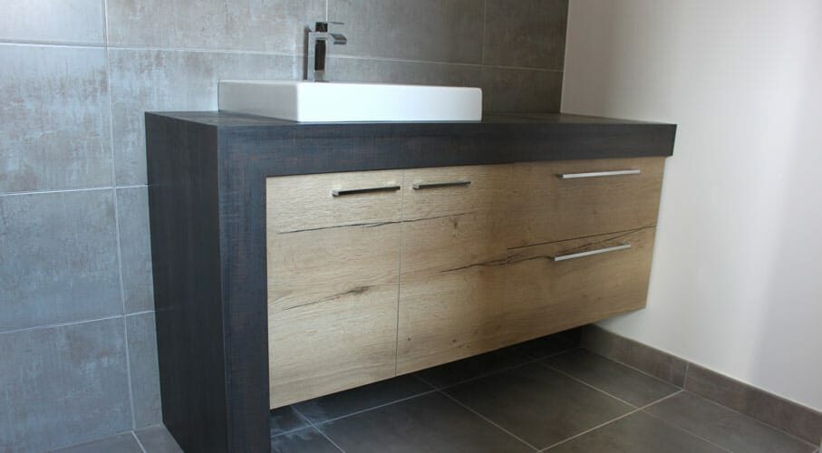 Meuble suspendu avec un plan épais couvrant le côté du meuble