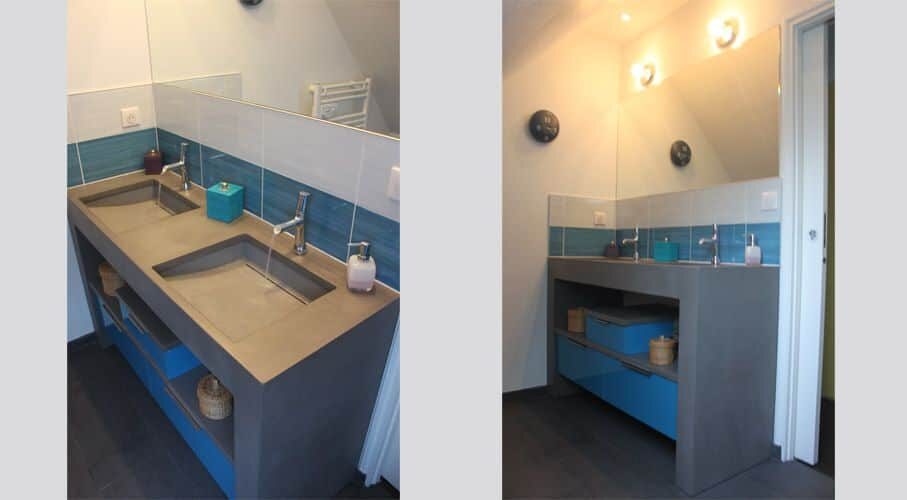 Plan sur le dessus des caissons tiroirs aspect béton ciré gris « BAHO ».