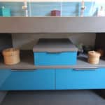 Caissons tiroirs avec façades verre laqué Bleu personnalisé.