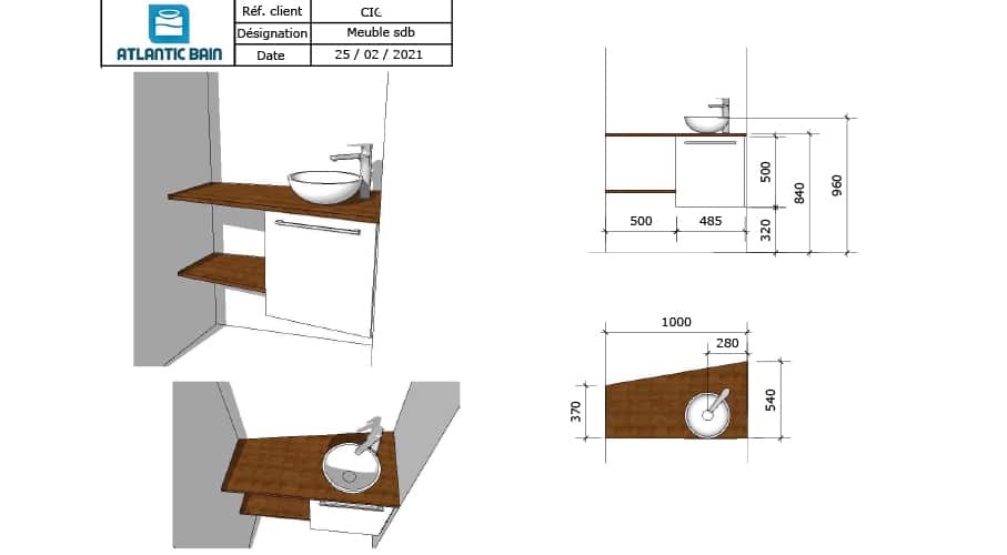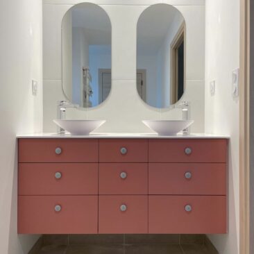 Meuble de salle de bain sur mesure entre deux murs – profondeur asymétrique