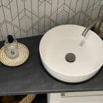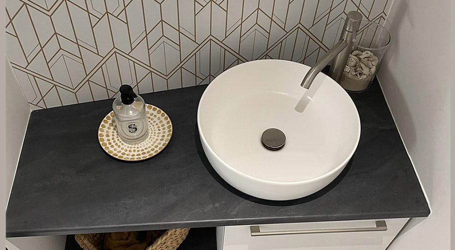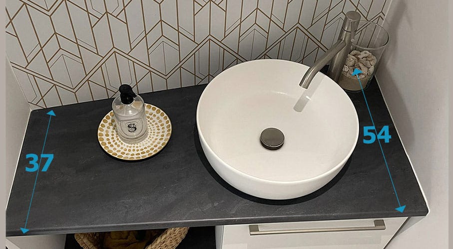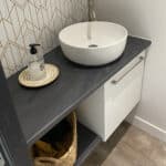 Le plan sombre contraste élégamment avec la vasque ronde blanche, apportant modernité et légèreté visuelle.